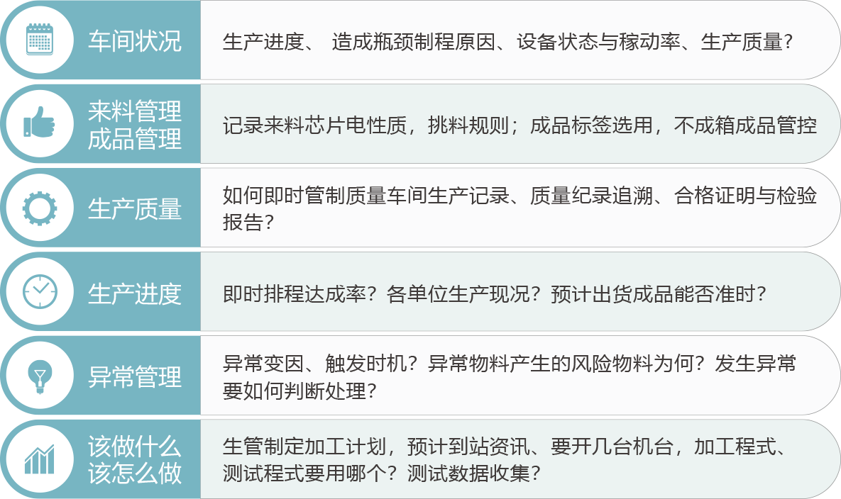iMES系统实现自动化全流程生产,来料芯片、电性挑料、在制品追踪管理。车间完成可视化管理与看板,有效 进行生产设备状态的追踪管理,对品质有效的保证。